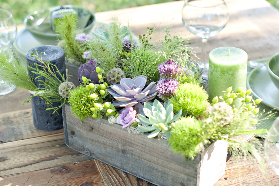 The woods created the perfect backdrop for this lush palette of greens and purples, which really pops against the natural elements. We love the succulents in the centerpieces—so gorgeous!