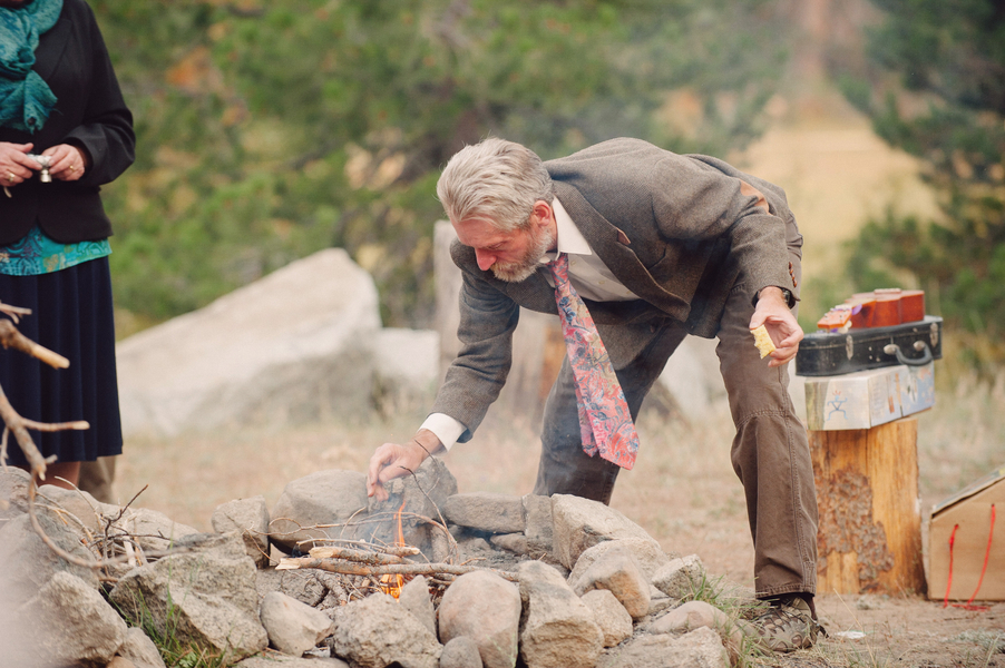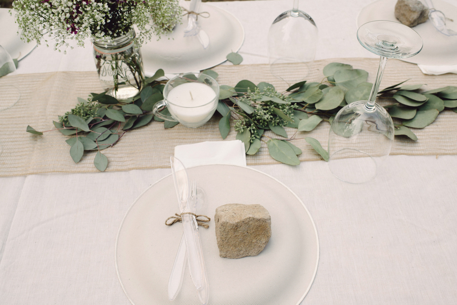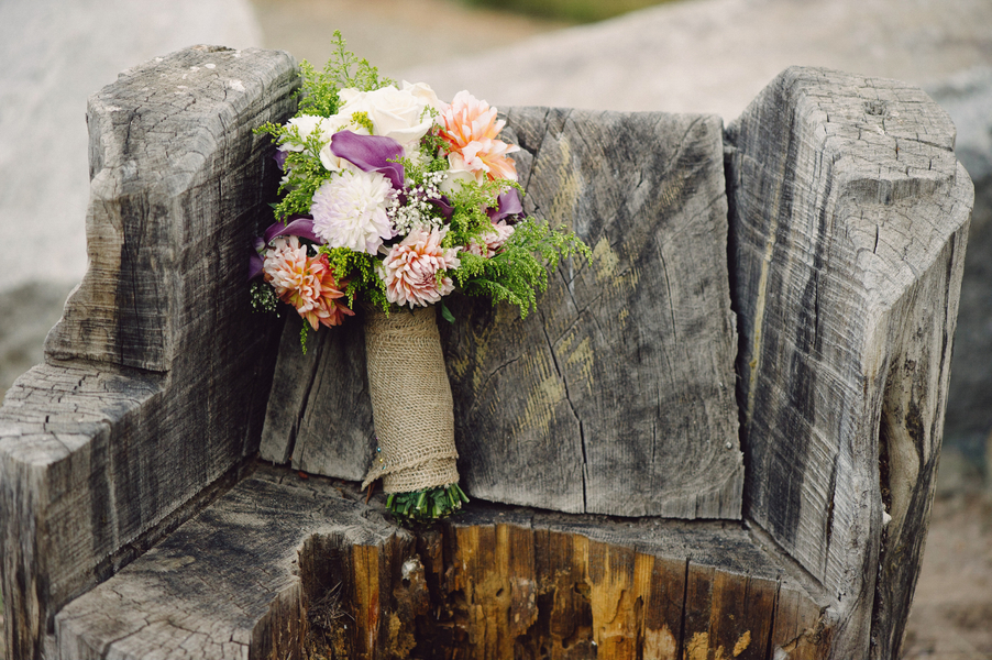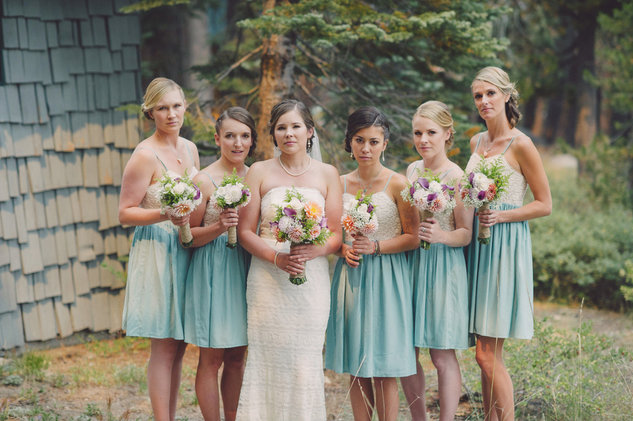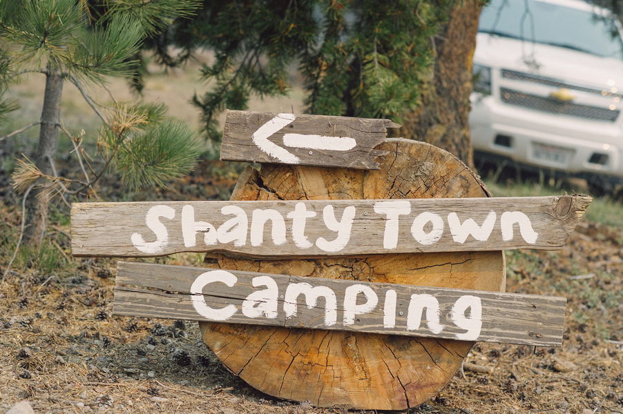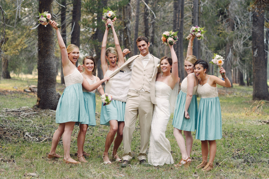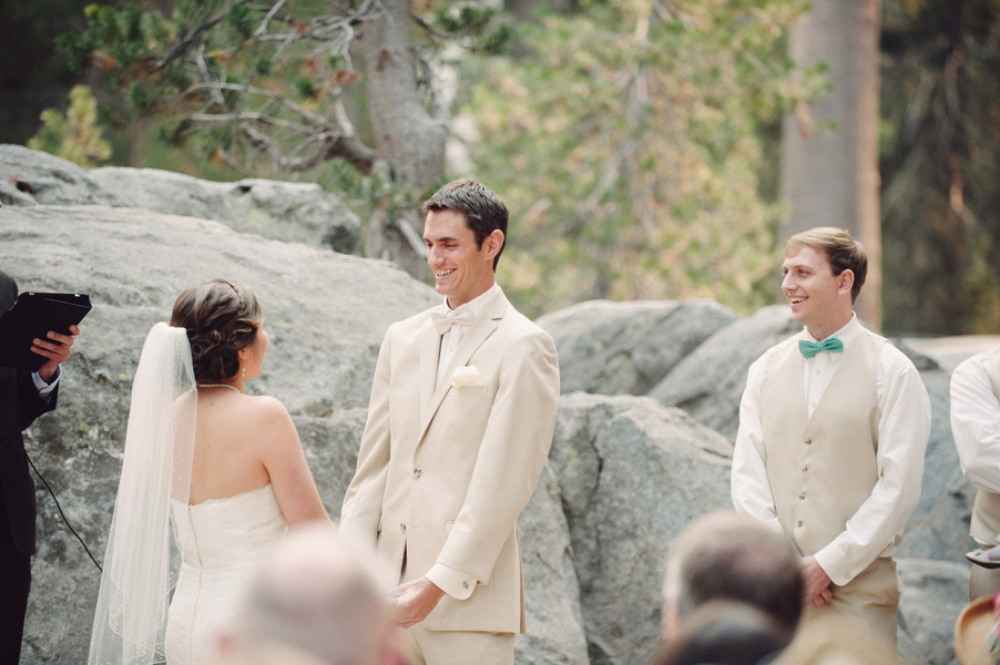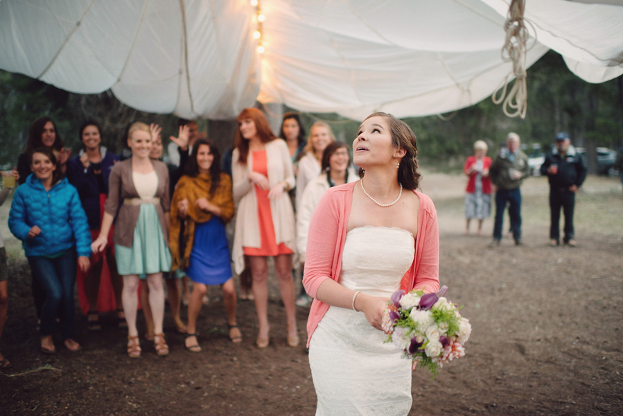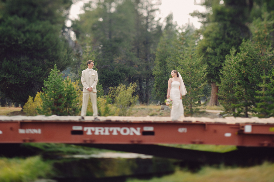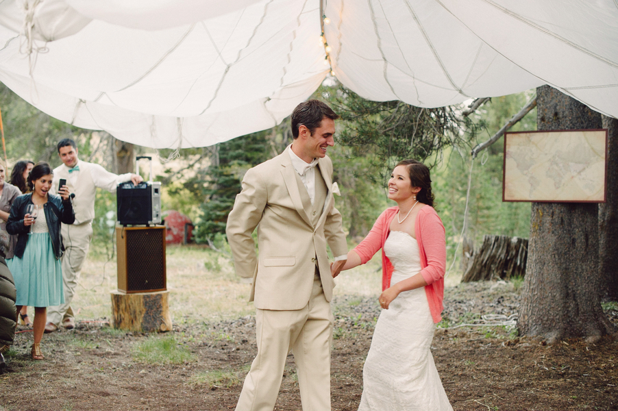 Sierra + John married at a meadow in Bear Valley, California. The location held special meaning for the couple, as Sierra’s family owns the property, and her grandfather practically built the entire area. It was perfect for their rustic chic wedding day. And in addition to a beautiful location, Sierra + John incorporated some cool eco details into their celebration, including a recycled parachute-turned-dancefloor-canopy!