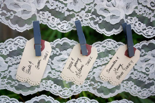 Escort cards can serve dual purposes (say seating and favors) and they make great DIY projects too. To display them, you may choose a bit of vintage lace for your display, a repurposed window or fun drinks to welcome your guests to their seats for the next phase of your wedding celebration.