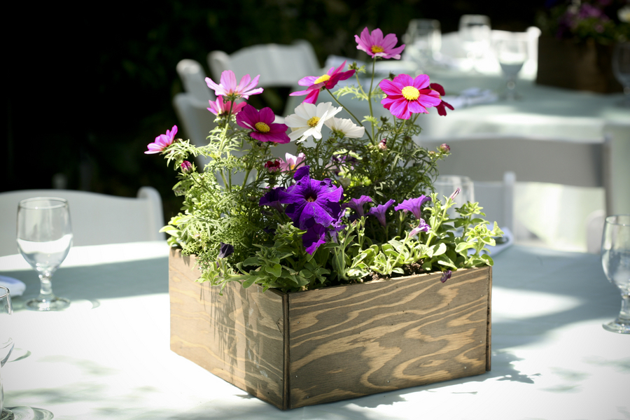 The bride’s father made these beautiful reusable wood flower boxes for various tables and they used potted plants inside each box - which were all seasonal and local.